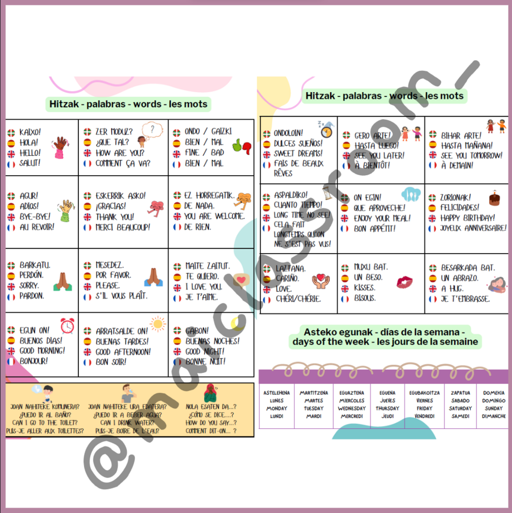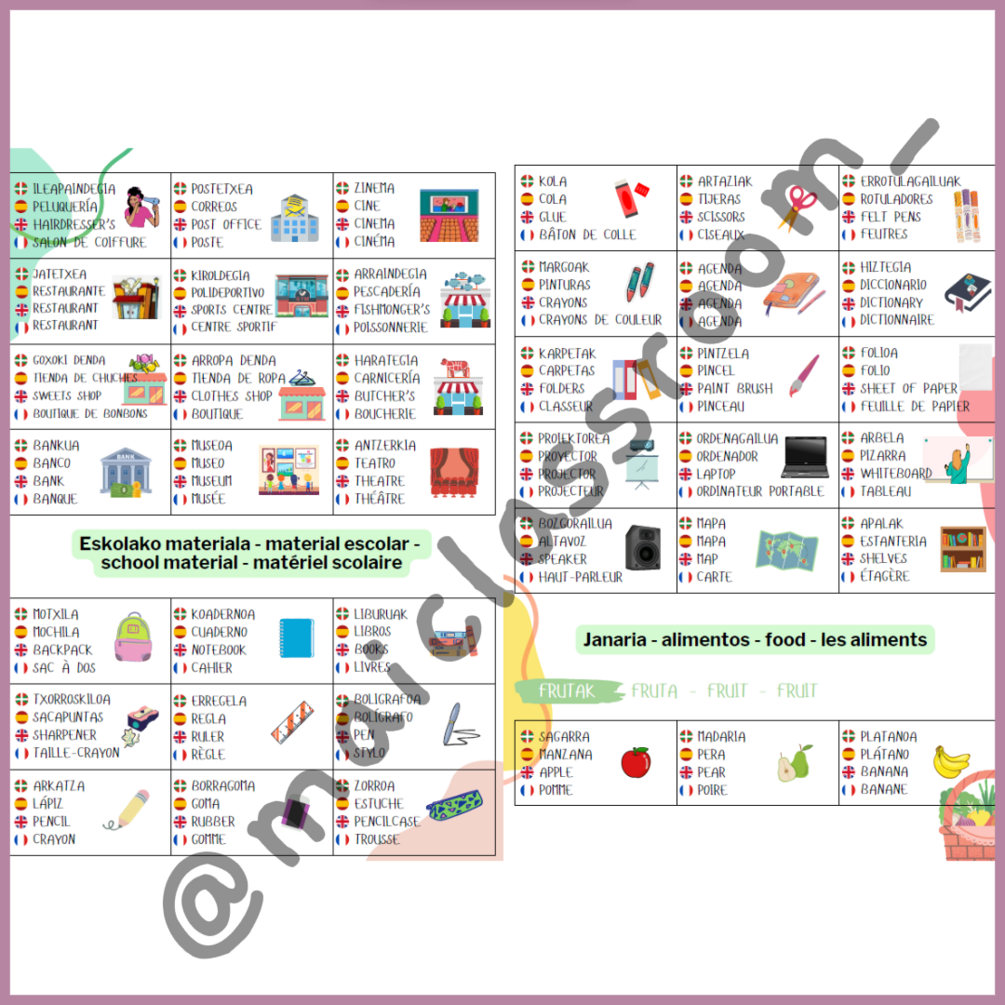 [ENG] This PICTURE DICTIONARY, made up of 27 sections, will allow you to learn a wide variety of words in BASQUE, SPANISH, ENGLISH and FRENCH.