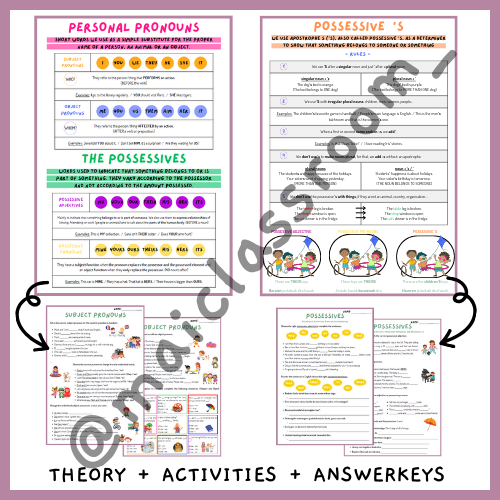 [EN] With this resource you will learn to use the personal pronouns and the possessives correctly. In addition to theoretical explanations, you will find a variety of activities to put into practice what you've learned and you will have their answerkeys too. Want to start working?